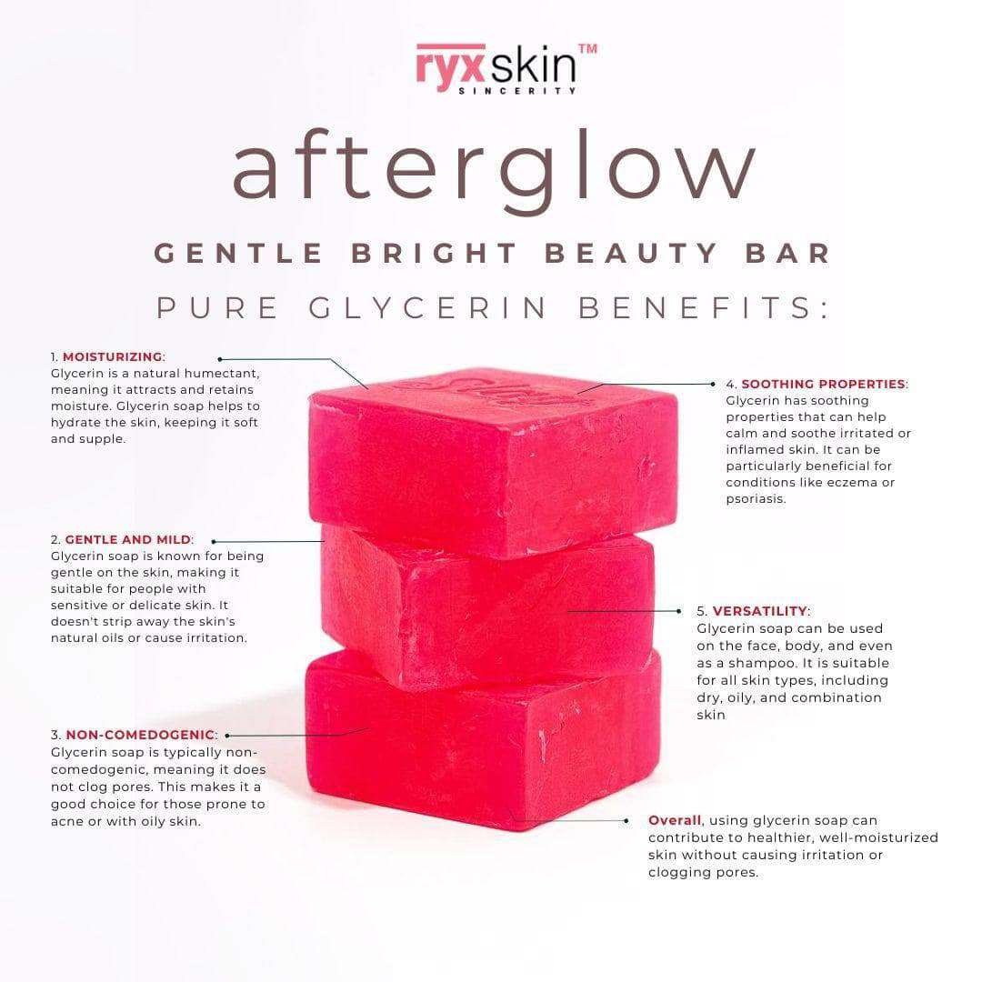 Experience the glow with RYXskin Afterglow—a glycerin-based beauty bar crafted for gentle brightening and deep hydration. Perfect for sensitive skin, it soothes, moisturizes, and won’t clog pores. Use it on your face, body, or even as a shampoo bar for a versatile, radiant cleanse.
