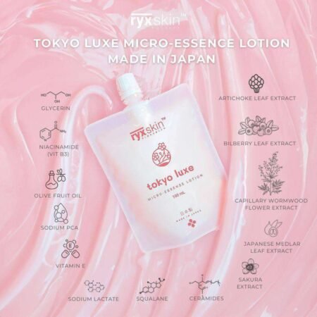 Ryxskin Sincerity Tokyo Luxe Micro Essence Lotion 100ml is a lightweight, hydrating, and nourishing lotion that helps to repair damaged and inflamed skin, providing intense skin soothing, brightening, and lightening. It is formulated for extra sensitive skin and is made in Japan.